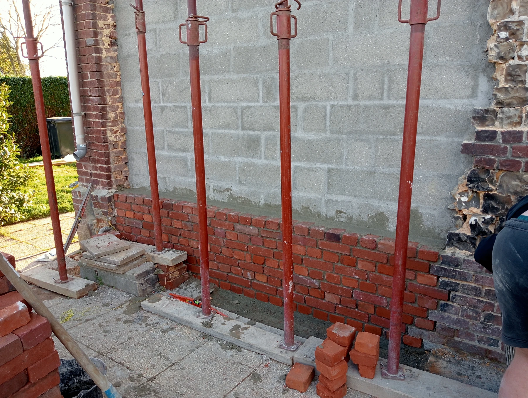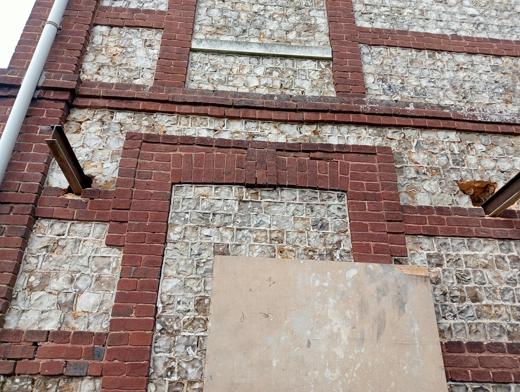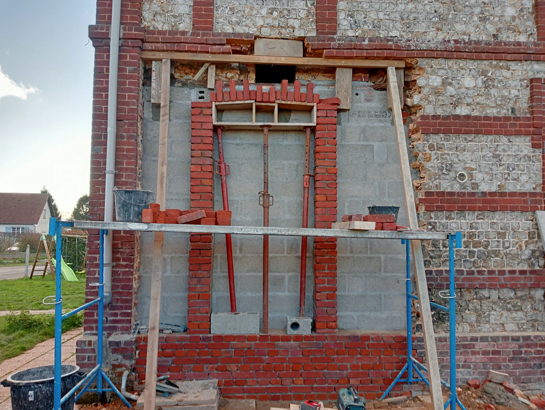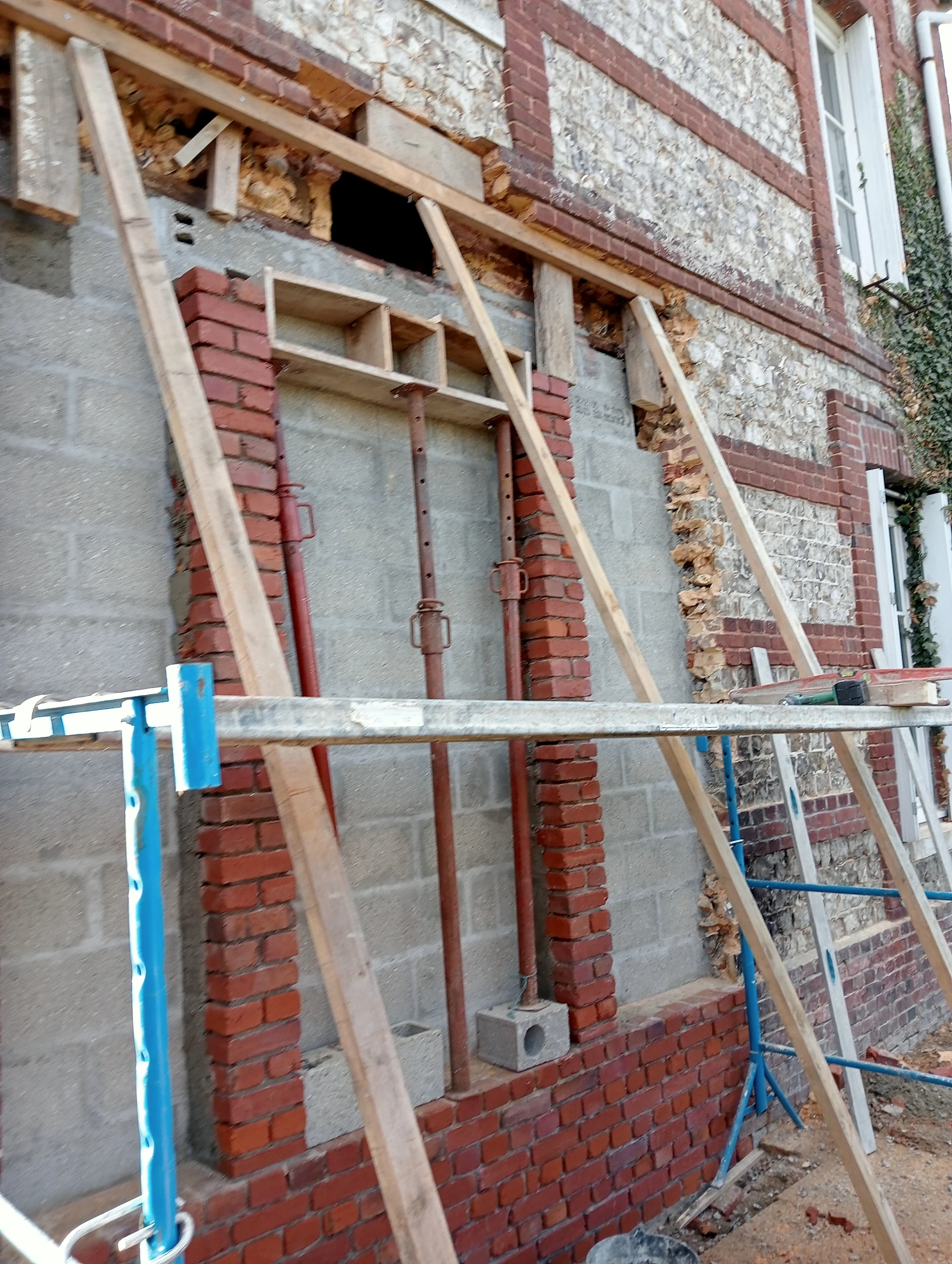 travaux de rénovation sur une façade en brique et silex